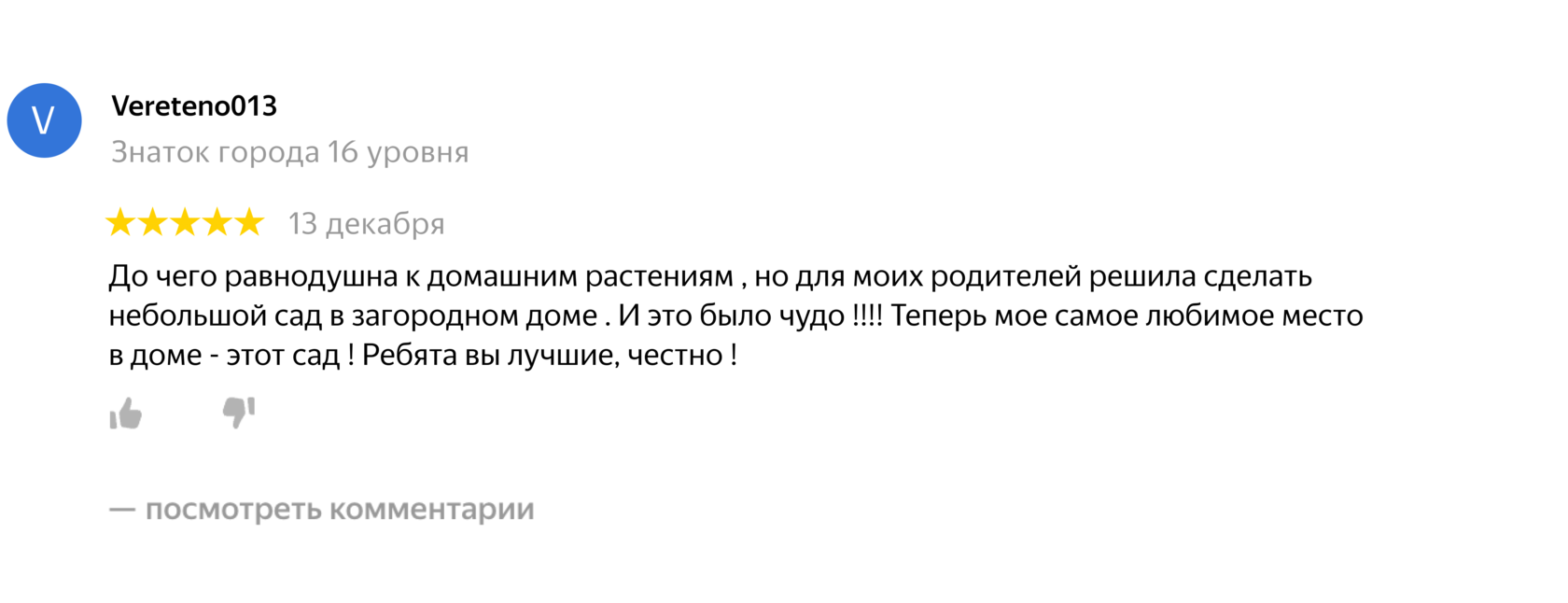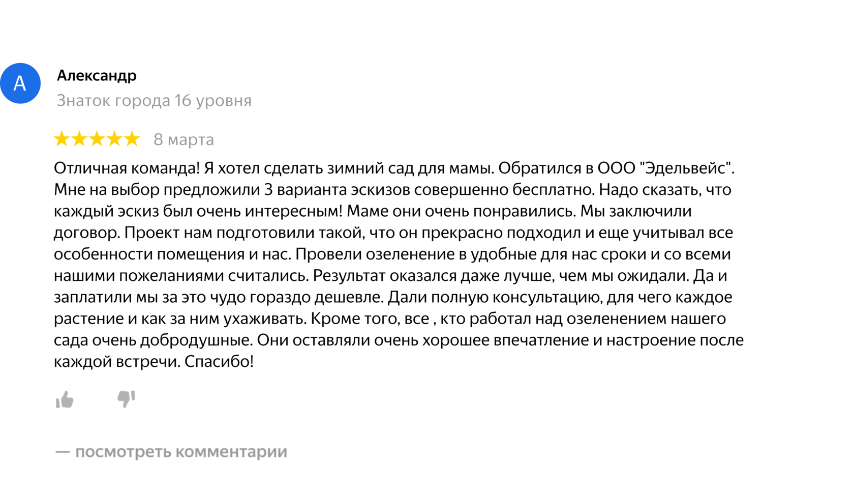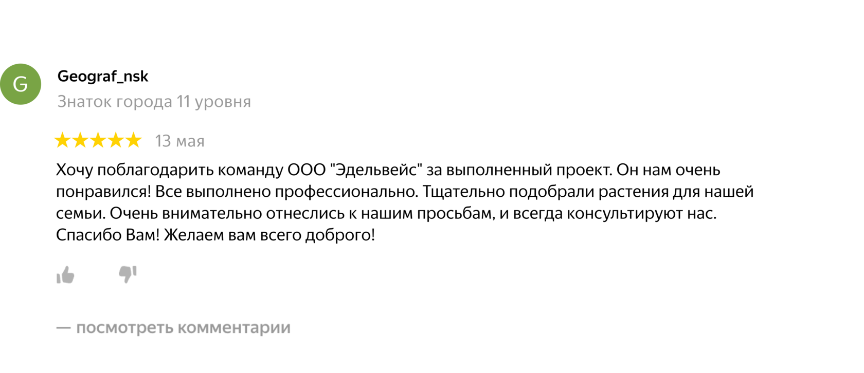 "Хочу поблагодарить команду ООО "Эдельвейс" за выполненный проект. Он нам очень понравился! Все выполнено профессионально. Тщательно подобрали растения для нашей семьи. "