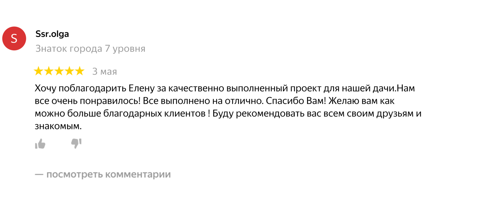"Хочу поблагодарить Елену за качественно выполненный проект для нашей дачи.Нам все очень понравилось! Все выполнено на отлично. Спасибо Вам! Желаю вам как можно больше благодарных клиентов!"