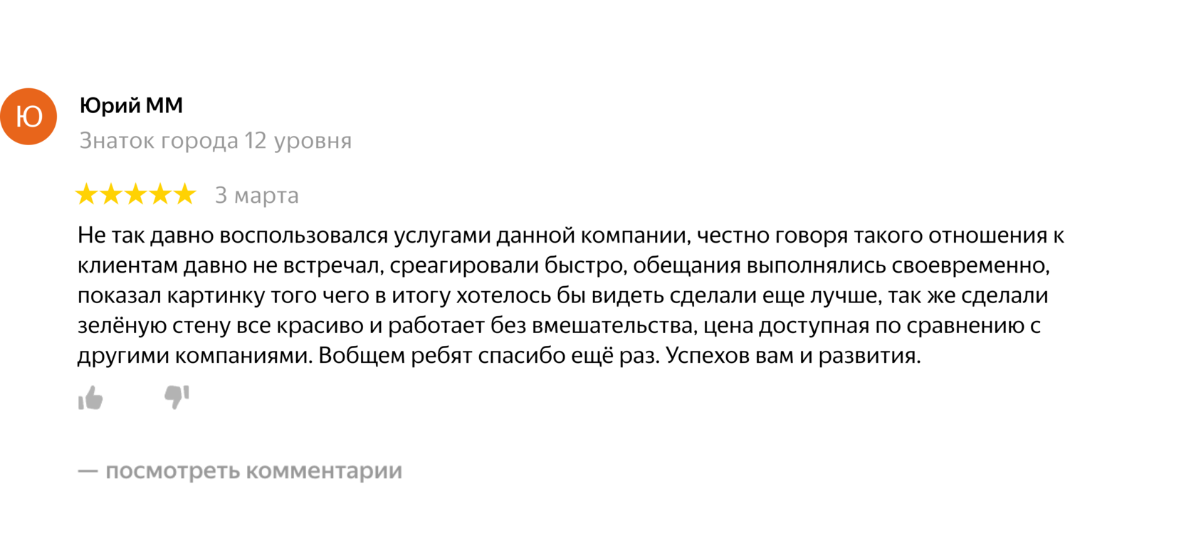 "Сделали еще лучше, так же сделали зелёную стену все красиво и работает без вмешательства, цена доступная по сравнению с другими компаниями. Вобщем ребят спасибо ещё раз. Успехов вам и развития."